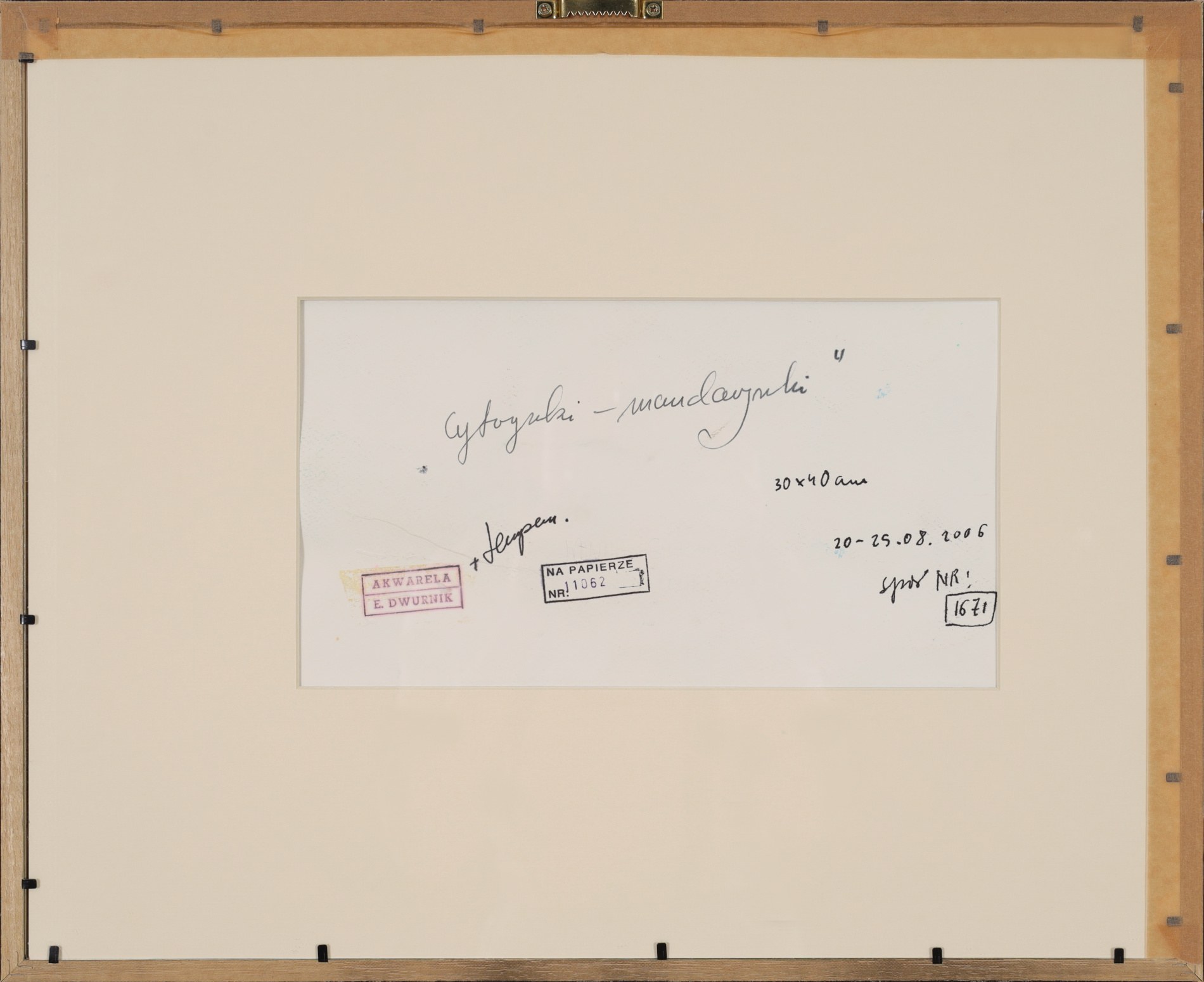 Opisany tuszem na odwrocie: "30 x 40 cm"; "20-25.08.2006"; "spis NR: | 1671"